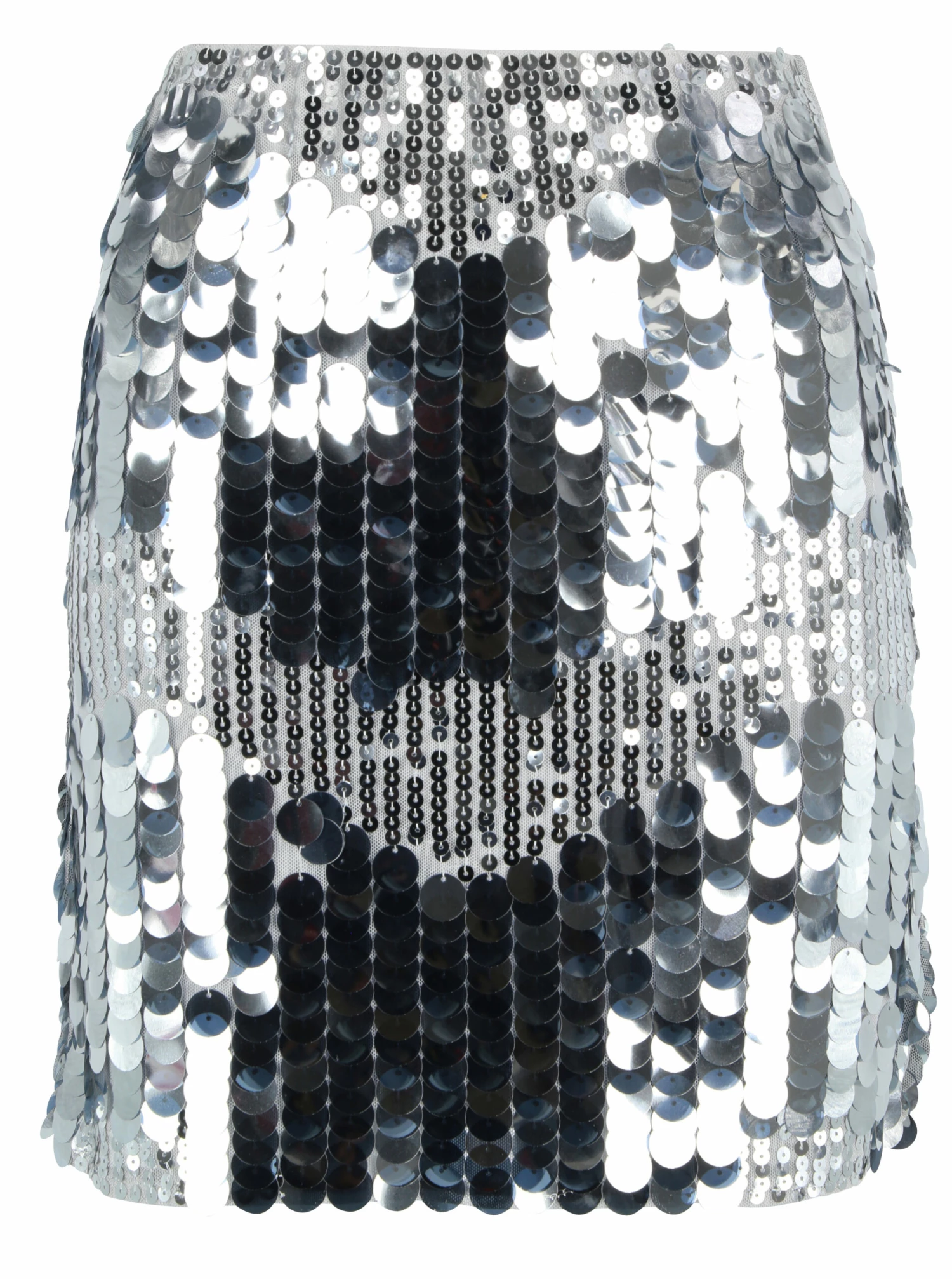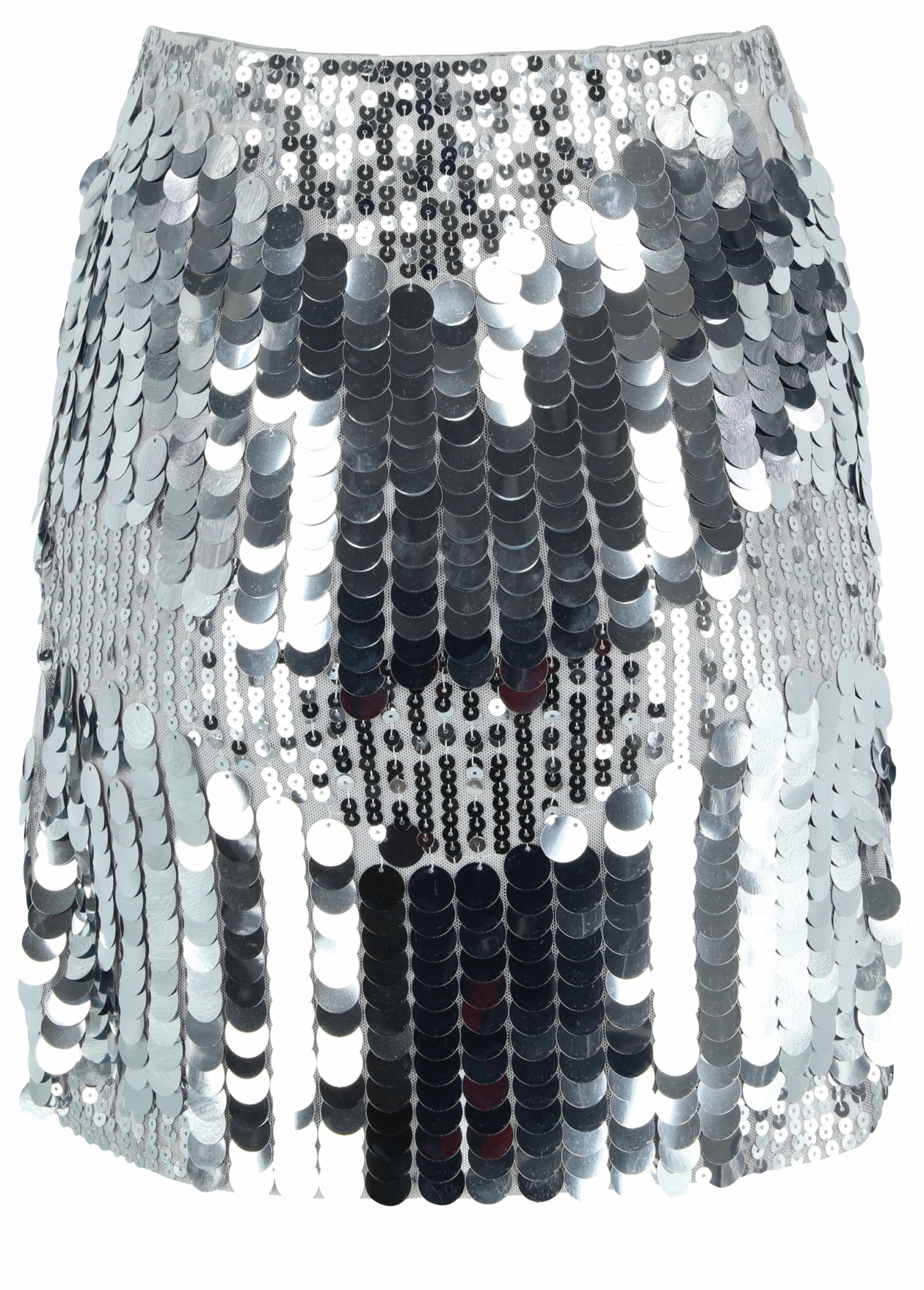 Kurzer Paillettenrock mit Gummiband in der Taille. Der Rock ist silbern und hat gemischte Pailletten.