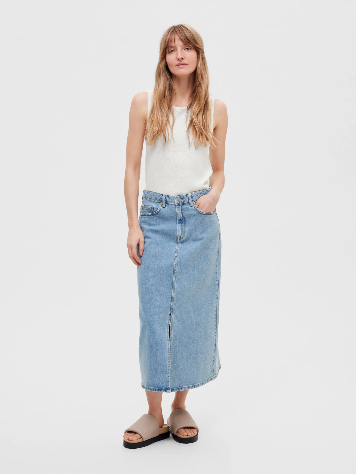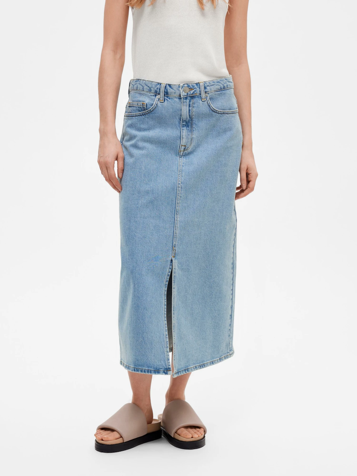 Dieser Jeansrock in Midi-Länge wurde mit Blick auf Langlebigkeit und Vielseitigkeit gefertigt. Er besteht aus recycelter Baumwolle mit etwas Stretch, damit er lange seine Form behält, und hat eine hellblaue Waschung mit Faded-Effekt. Der Frontschlitz sorgt für Bewegungsfreiheit, während die silbernen Nieten und Knöpfe und das klassische 5-Pocket-Design den Look vervollständigen. Kombiniere ihn mit einer schwarzen Satinbluse und Chunky Loafern zu einem schicken Look oder ganz einfach mit einem T-Shirt und Turnschuhen.- High Waist- Hosenschlitz mit Reiß- und Knopfverschluss- Gürtelschlaufen- 5-Pocket-Design- Frontschlitz- Silberfarbene Beschläge- Regular FitMIT RECYCELTER BAUMWOLLEDieses Produkt enthält recycelte Baumwolle. Recycelte Baumwolle schont die natürlichen Ressourcen und reduziert Textilabfälle.